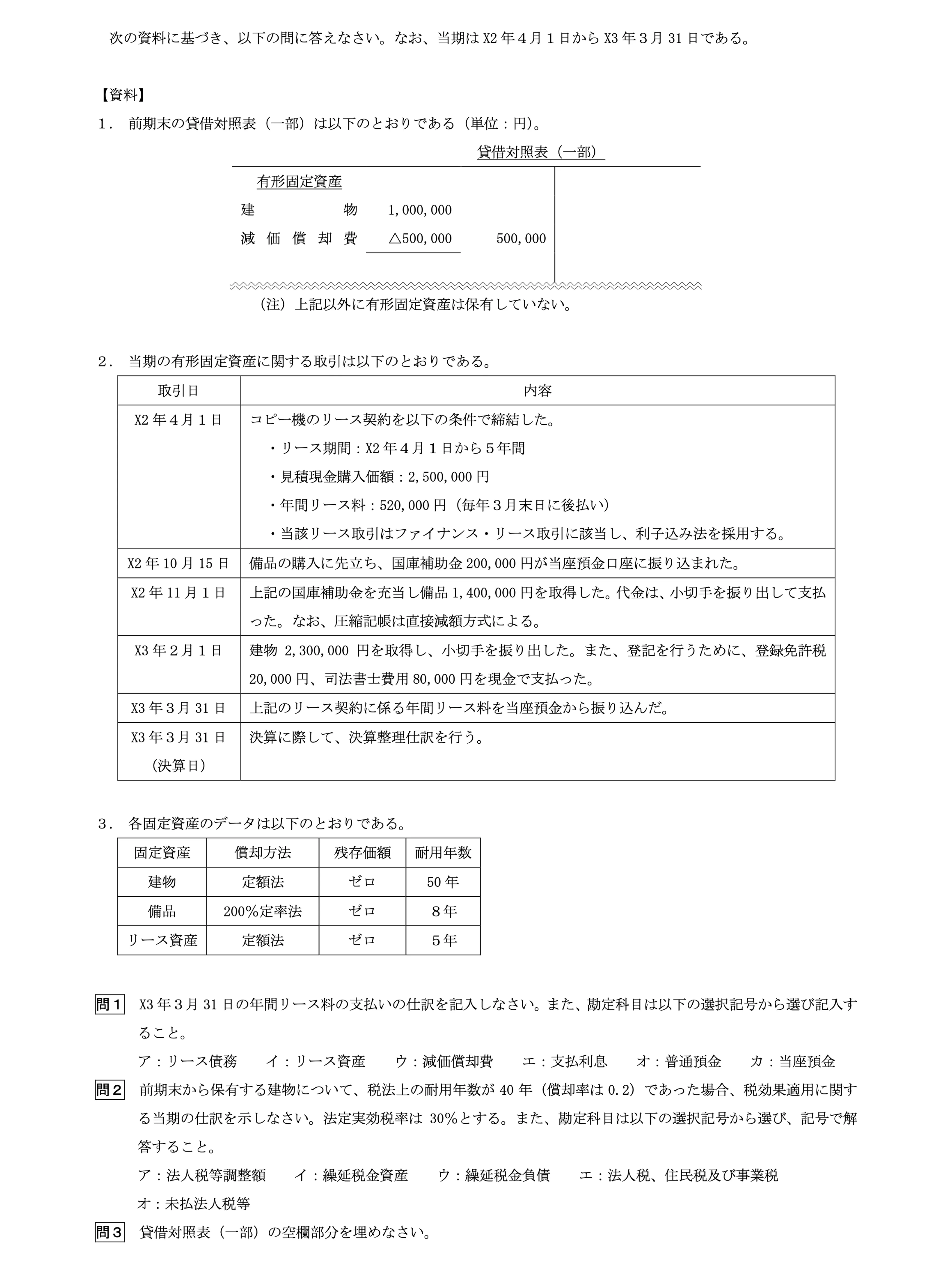 X3年3月31日の年間リース料の支払いの仕訳を記入しなさい。