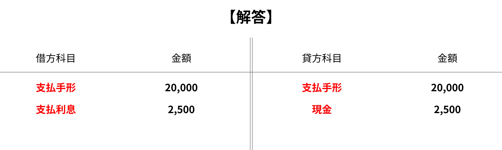 茨木商事は材料費の高騰に伴い資金繰りが悪化したため、約束手形¥20,000について支払期日延期の申し出をし、1ヶ月後を満期日とした新手形と交換した。なお、支払遅延に伴う利息¥2,500を別途現金で支払った。